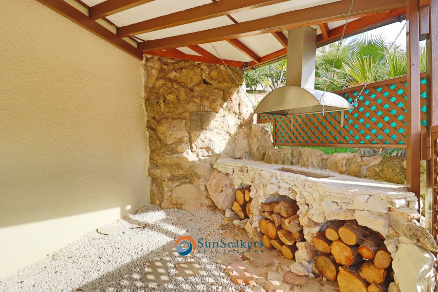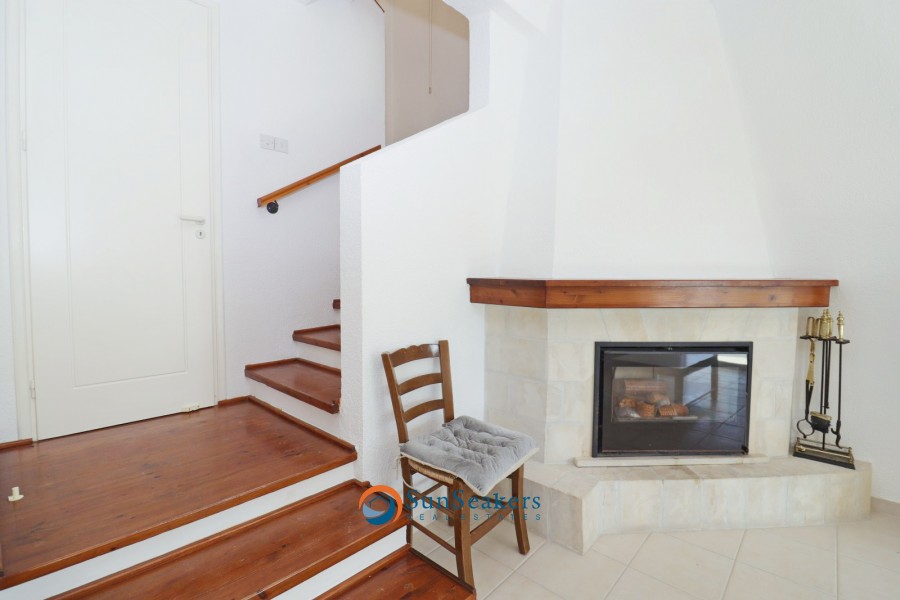 The property is accessed via private parking, from which a short staircase leads to the entrance and outdoor living areas. Upon entry, the villa welcomes you into a comfortable interior that flows seamlessly into a spacious open-plan living and dining area. A classic fireplace adds warmth and character, while large sliding windows frame picturesque pool views, flooding the space with natural light and providing direct access to the veranda and BBQ area, ideal for al fresco dining and entertaining amid a natural backdrop. This level also accommodates a separate, well-appointed kitchen and a guest cloakroom. The property further benefits from provisions for central heating, as well as brand new air conditioning units installed throughout, ensuring year-round comfort.