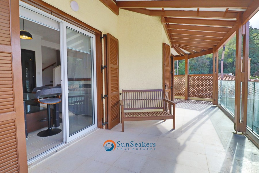 An internal staircase leads to the first floor, where the master bedroom features en-suite facilities and sliding doors opening onto a private garden with dedicated relaxation and seating areas. Two additional double bedrooms share a family bathroom, one of which enjoys access to a private balcony offering partial sea views and tranquil natural vistas.