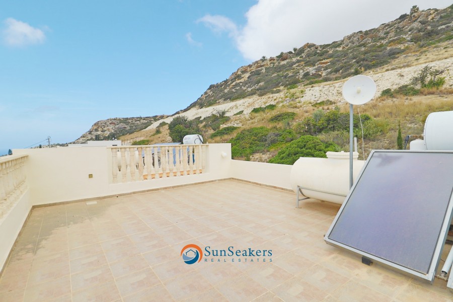 Taking the staircase to the first floor, you will find two generously proportioned double bedrooms, each complete with en-suite facilities. Both bedrooms offer direct access to a shared balcony, ideal for morning coffee or evening relaxation, with seating areas overlooking the sea. A spiral staircase leads from this level to a private rooftop terrace, where 360-degree views of the Mediterranean Sea, surrounding mountains, and unspoiled natural landscapes create a truly breathtaking setting.