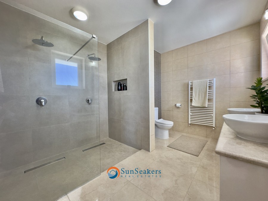 The 3 extensive upstairs bedrooms are open to a majestic terrace overlooking the beautiful beaches and coastline of Paphos. The airy master bedroom has a large ensuite bathroom with a luxurious double shower and a spacious dressing room. The airy second and third bedroom on the upper floor has their own bathrooms as well as generous wardrobes. On the ground floor there is a fourth bedroom which can
