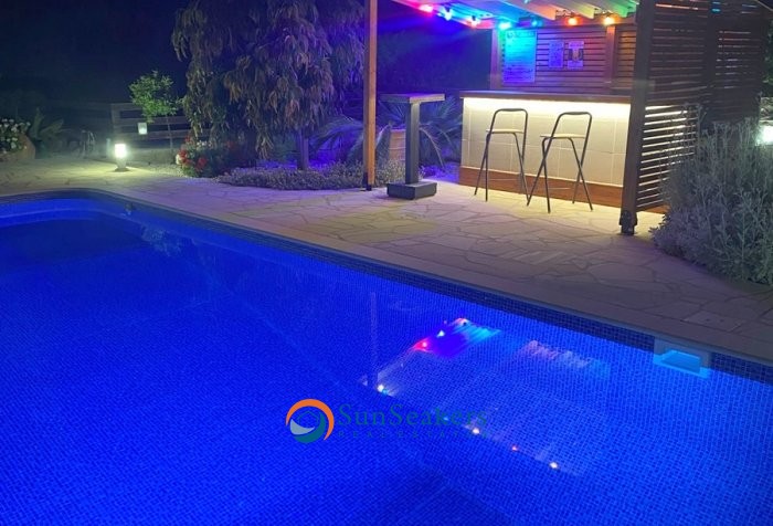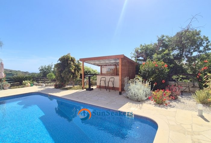 Outdoors, the property boasts a private swimming pool, landscaped gardens, and a sun terrace perfect for relaxing or entertaining. Additional features include private parking, storage areas, and proximity to local amenities, including shops, cafes, and the renowned Tala Monastery.