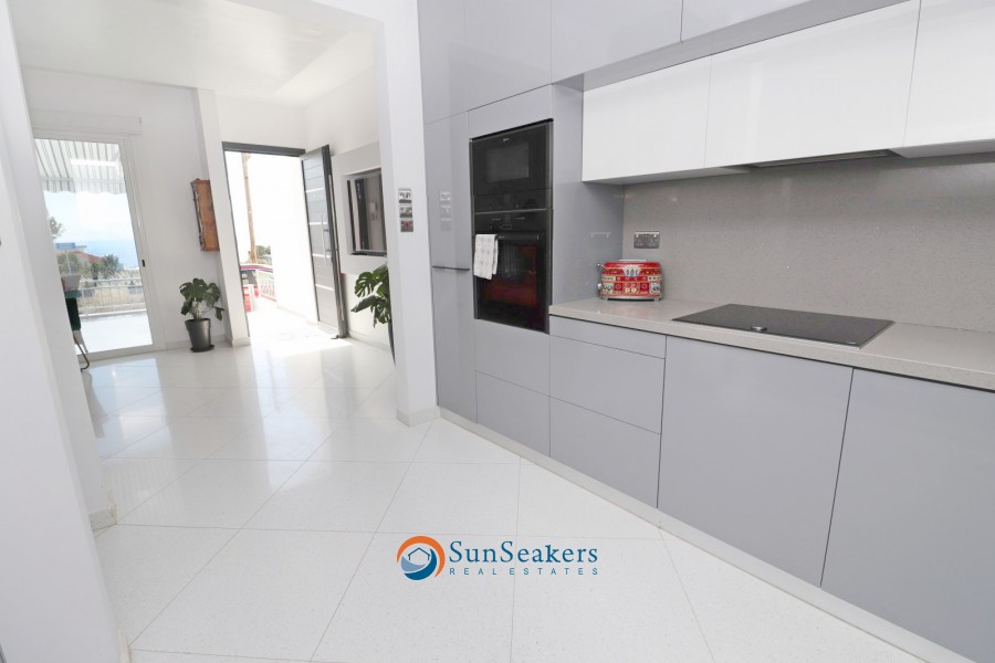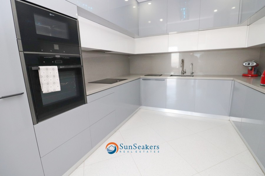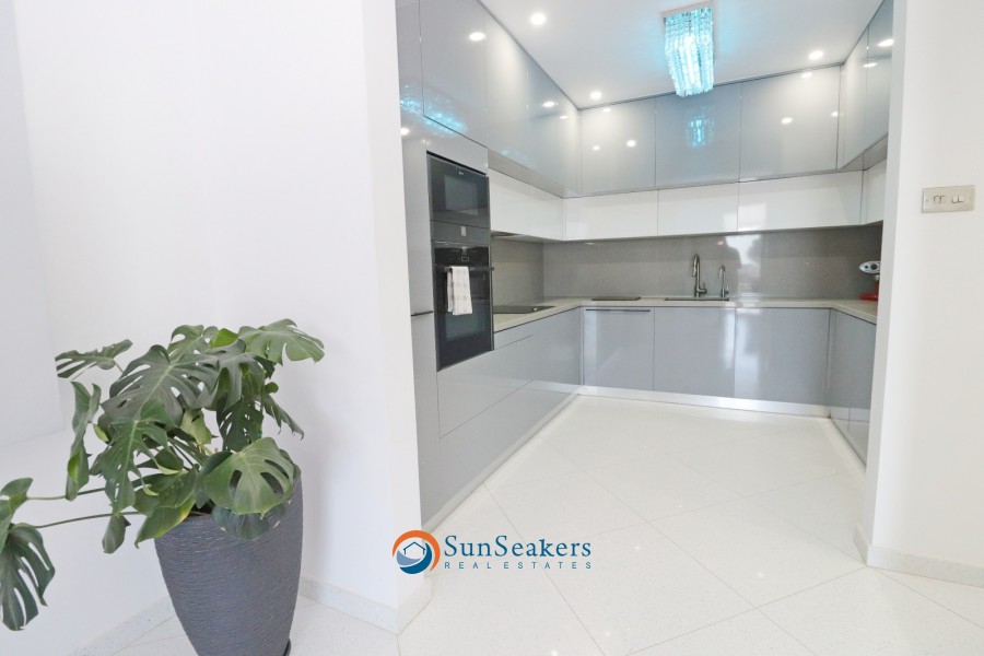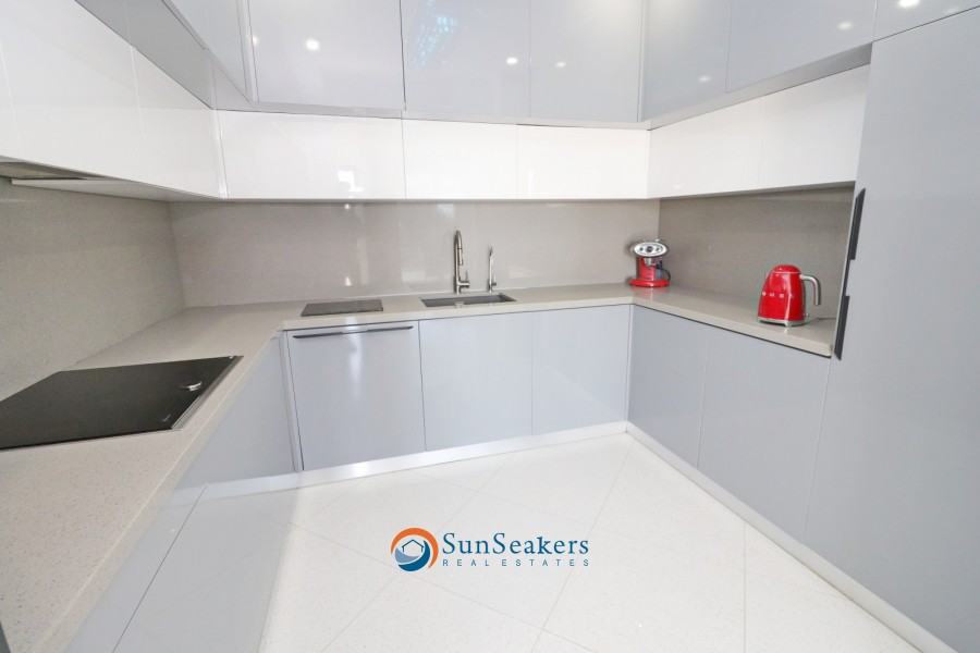 Set on the ground floor, this bright and airy apartment enjoys a privileged corner position, offering enhanced privacy and stunning sea views. The property features an open-plan lounge and dining area that seamlessly connects to a sleek, fully equipped kitchen with modern finishes and integrated appliances that maintain a clean, contemporary aesthetic.