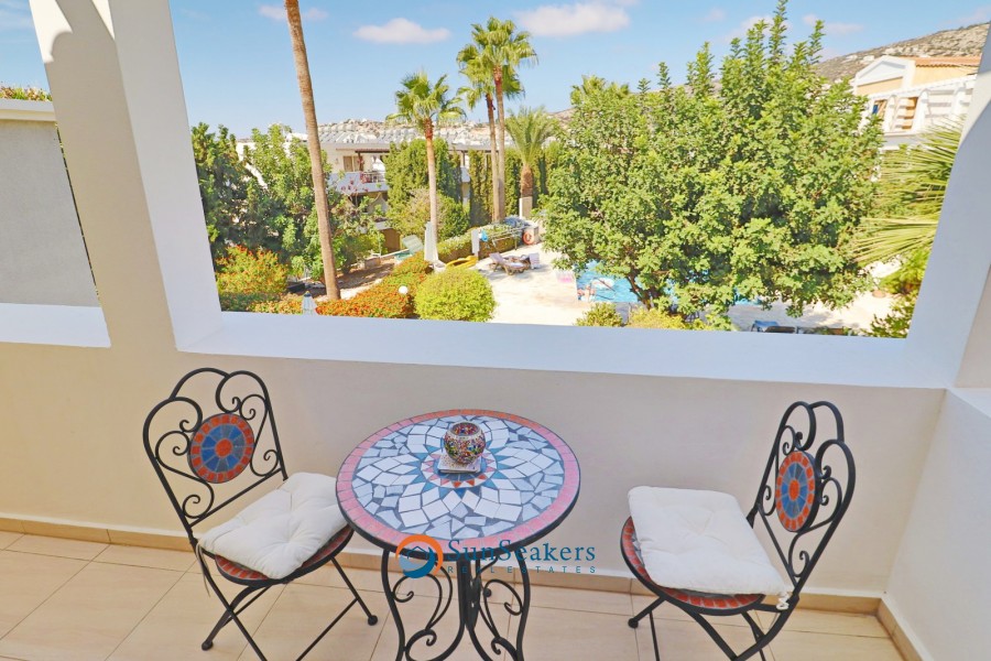 Taking the staircase to the first floor, you’ll find two generously sized double bedrooms, each offering a tranquil retreat. The master bedroom opens onto a large private balcony that boasts breathtaking views of the beautifully landscaped gardens, the shimmering communal swimming pool, and the majestic mountains beyond. This space is perfect for enjoying morning coffee or unwinding in the evening with the serene vistas that surround you. The second bedroom is equally spacious and shares access to a beautifully appointed, modern family bathroom, which features sleek fixtures and a luxurious feel that complements the overall style of the home.