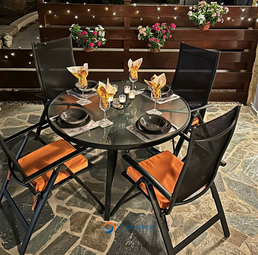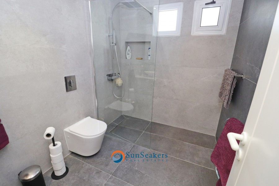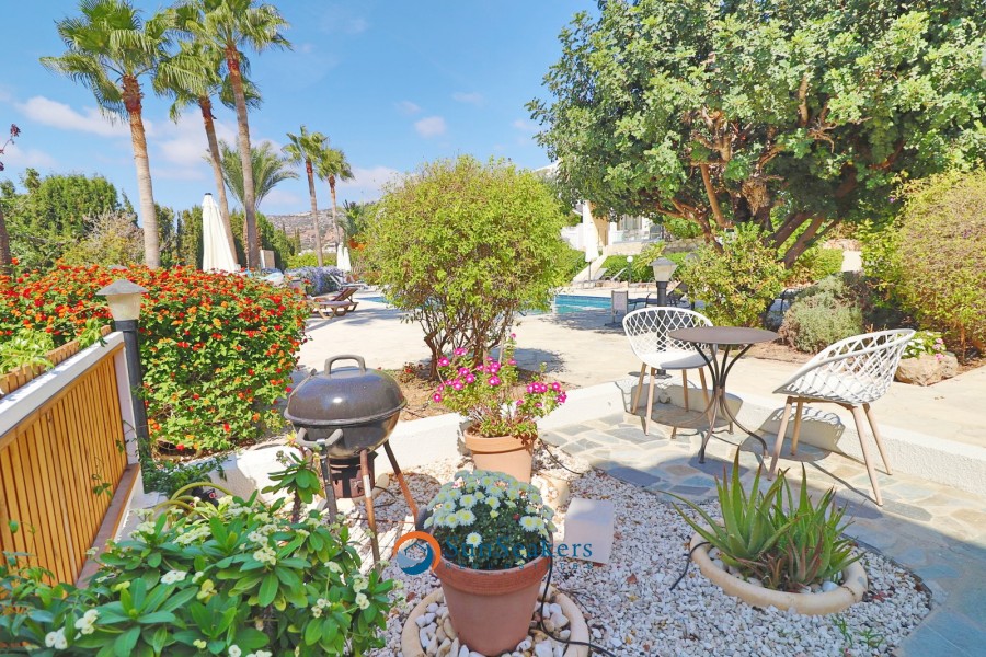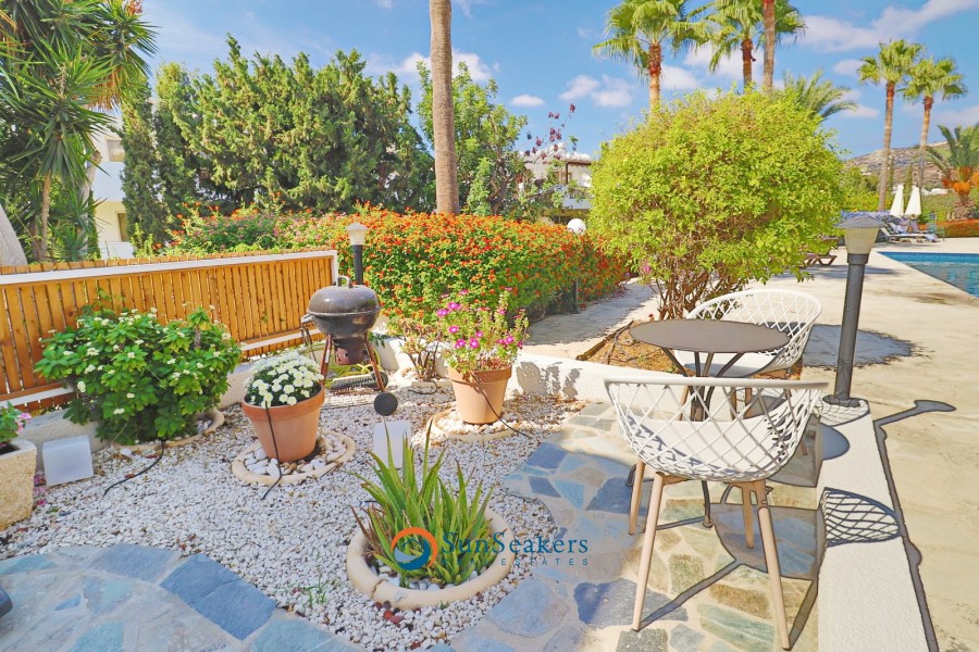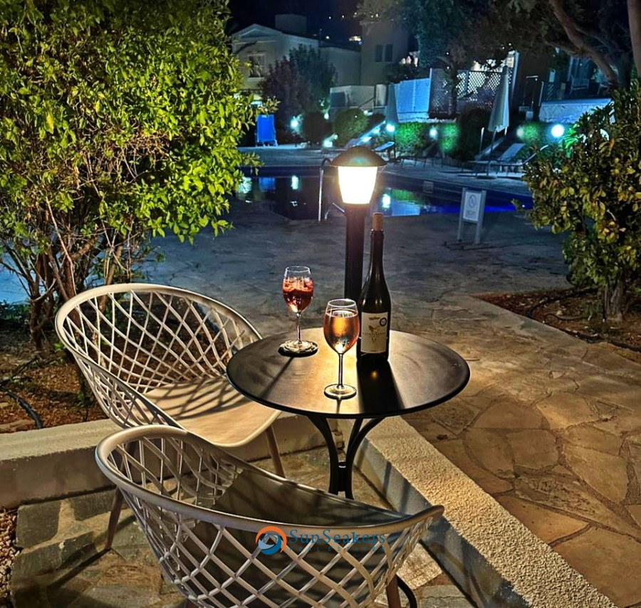 Stepping outside into the expansive outdoor area, you’ll be equally impressed by the thoughtful attention to detail. This private space is ideal for both relaxation and entertaining, with a variety of seating areas designed for al fresco dining, lounging in the sun, or simply enjoying the peaceful atmosphere. There is ample space for sun loungers, BBQ, making it the perfect setting for hosting outdoor gatherings or intimate parties. A short pathway from the outdoor area leads you directly to the communal grounds and the stunning swimming pool, offering the perfect combination of privacy and community.