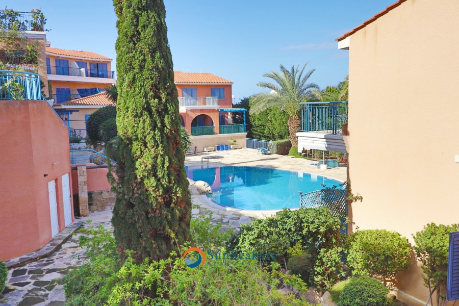 Accessed via the lower entrance, the ground floor comprises a bright open-plan living and dining area seamlessly connected to a well-appointed kitchen. From the living space, a charming veranda provides an inviting outdoor setting with tranquil views over the communal pool and gardens, ideal for relaxation or entertaining. A guest cloakroom completes this level.